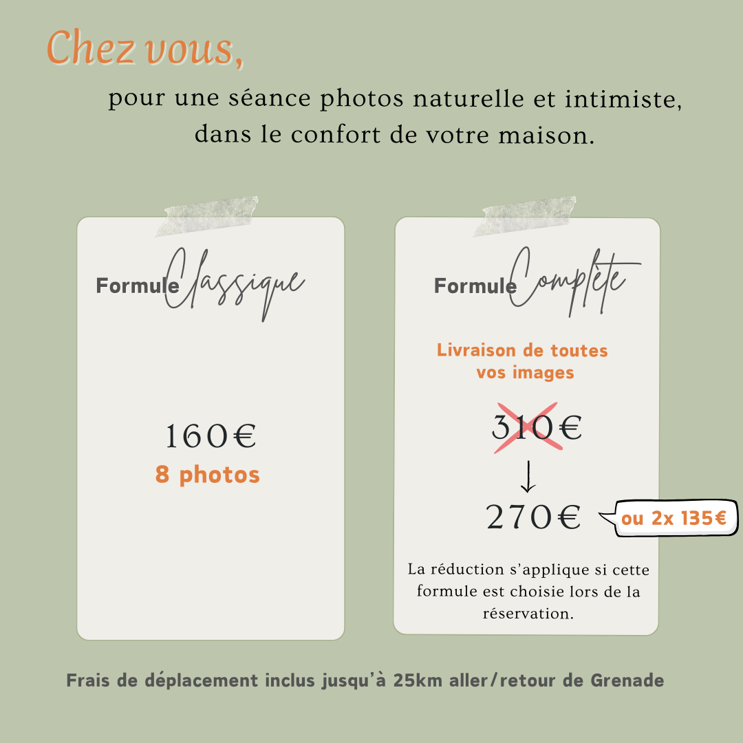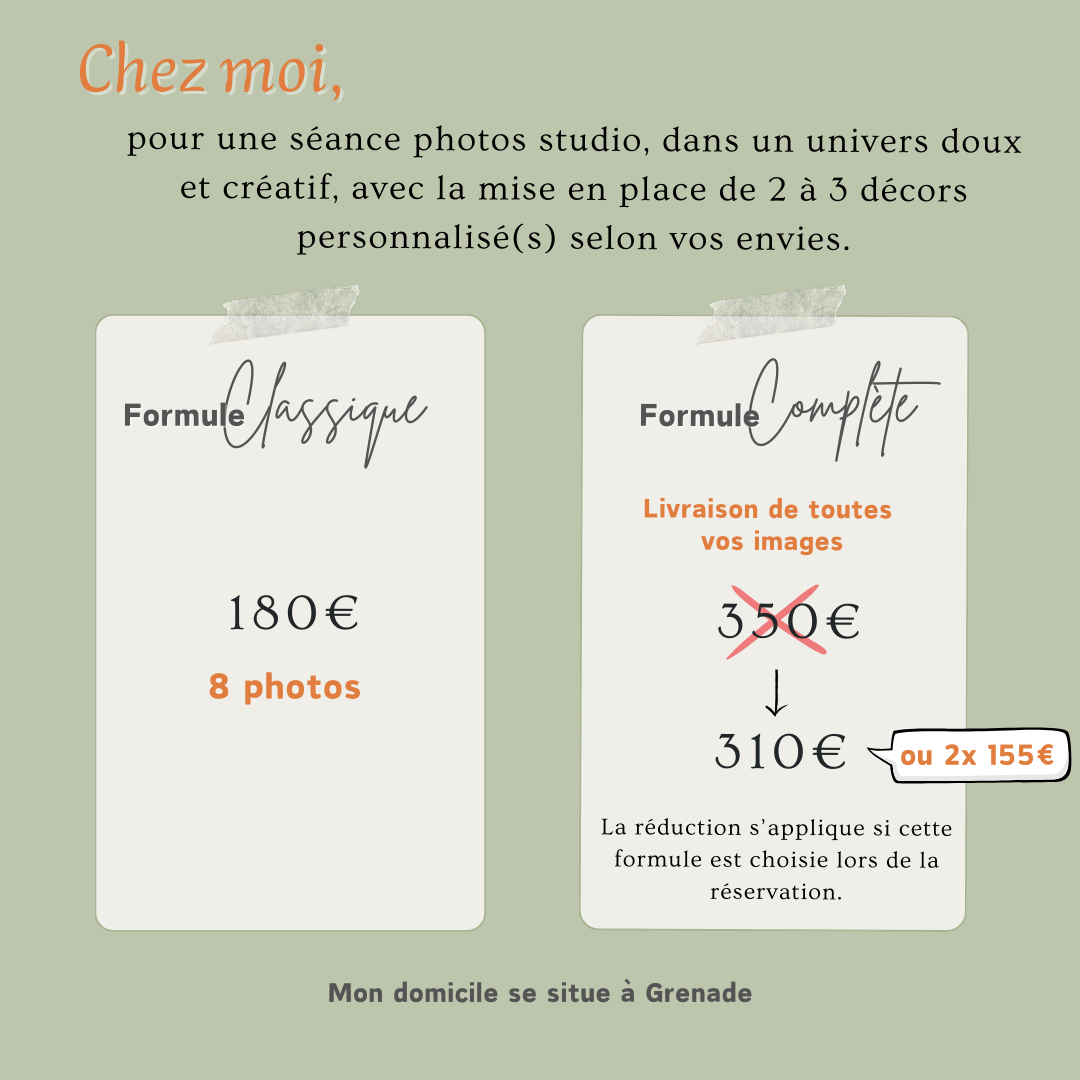 Pour le lieu, tout dépend du style d’images que vous souhaitez : je me déplace à votre domicile pour des photos intimistes et cocooning, ou vous venez dans ma maison pour réaliser des images en studio.